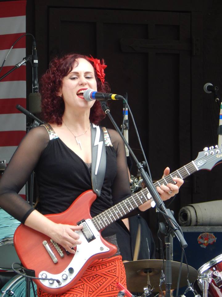 Erin Harpe’s show can not only be described as musically entertaining, but it is truly that- a show. They are nothing if not theatrical, and that played right into the crowd’s sensibilities. Erin’s costume, which always plays an important part of any show she does, was a perfectly coordinate red and black theme, replete with a cute red bow. During their song “Love Whip Blues,” the title track for their latest album, they even used their own “love whips” to swing around, screeching when Jim hit her with his. What a screech too! And with a beat (played by Bob Nisi) that sounds like Jessica Rabbit should be coming in the room, they launched into the song.