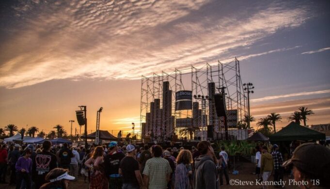 The folks in the middle of the arena would only have flip their chairs around to see the next stage. 9 Mile Skid is a local band from Ventura, they featured the song New Speedway Boogie a fitting tune that would be replayed many times over the weekend. With the setting sun falling behind the wall of sound they finished jamming their set and passed the torch over renowned Grateful Dead historian and voice of the GD Hour, David Gans. David was joined during his set by Stephen Inglis, one of the highlights was a beautiful Wharf Rat. The evening was cold and very windy with dirt and dust swirling around the complex as the Friday night headliner Cubensis hit the main stage.