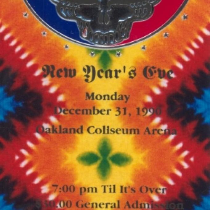 I moved from the East coast to the West coast in the fall of 1990, and was already a pretty big Deadhead. I was super fortunate and landed a mail order ticket to the New Year’s eve Dead show in Oakland, CA. Mail order was quite the ritualistic ordeal back then, and scoring this colorful ticket was no small event. In print on the bottom of the ticket, it said it all, “7 PM til it’s over.”